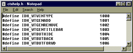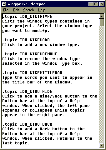 Der Name der Datei ist zwingend notwendig sonst funktioniert das ganze nicht (VB6 z.B. gibt die fasche Fehlermeldung aus, dass die Hilfedatei nicht geöffnet werden kann) . Der Aufbau ist wie folgt: In den Zeilen mit dem .topic wird ein eindeutiger Name eingetragen. Darunter wird der Context ohne CR/Wagenrücklauf geschrieben.