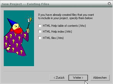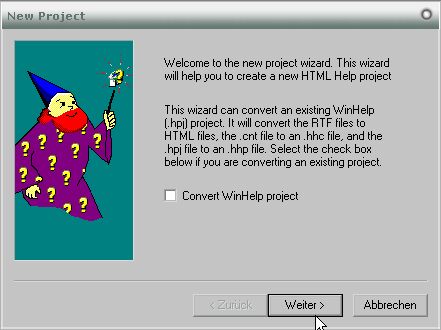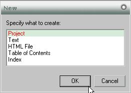 "Text" öffnet einen ASCII-Editor, "HTML File" einen den eingebauten html-Editor, "Table of Contents" und "Index" erlauben das Anlegen derselbigen. Nach Auswahl von 'Project' wird der Project-Wizzard gestartet: