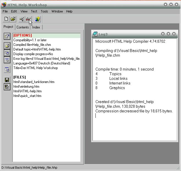Und nun bereits kann der erste compile Lauf gestartet werden. Im rechten Fenster wird das zugehörige Logfile angezeigt. Klickt man auf das Symbol mit der Brille so wird die gerade compilierte Hilfe angezeigt: